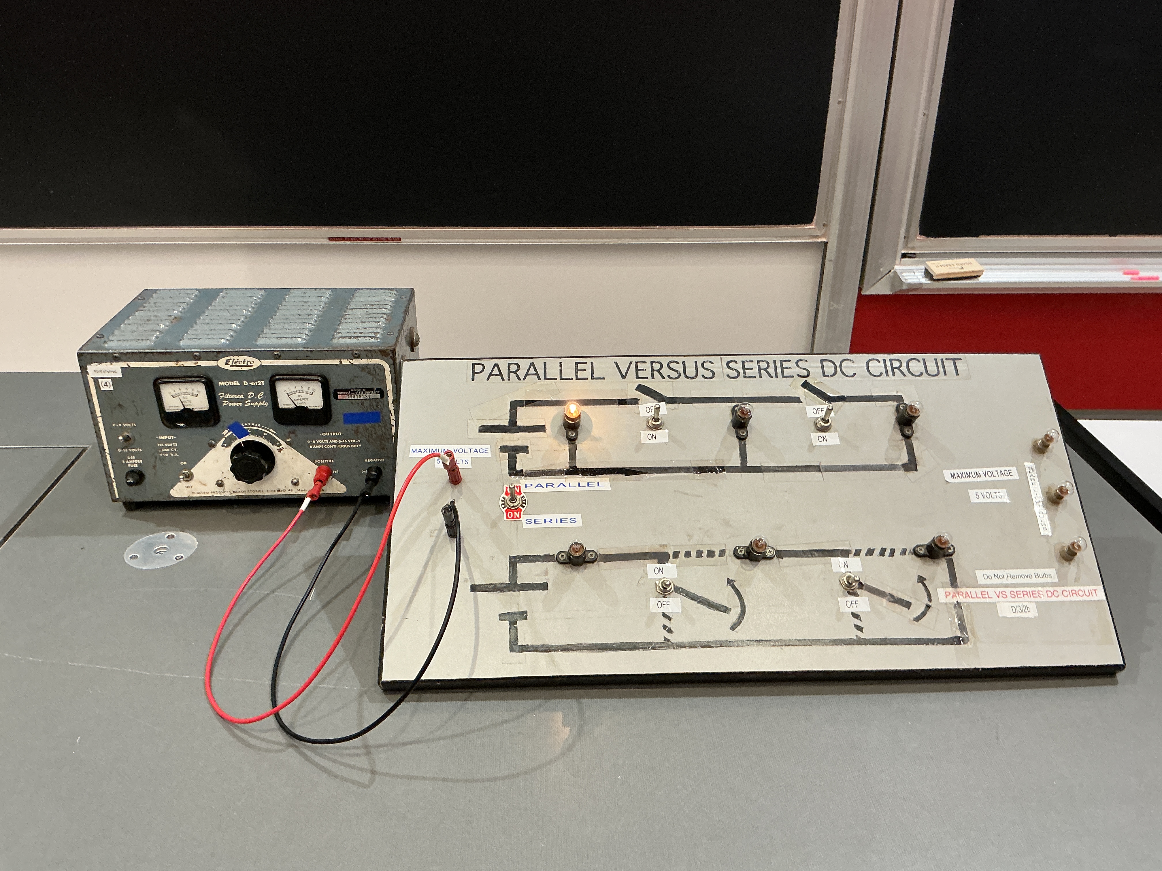 Description: Using a DC power supply and 3 light bulbs of identical wattage explain properties of parallel and series circuits.