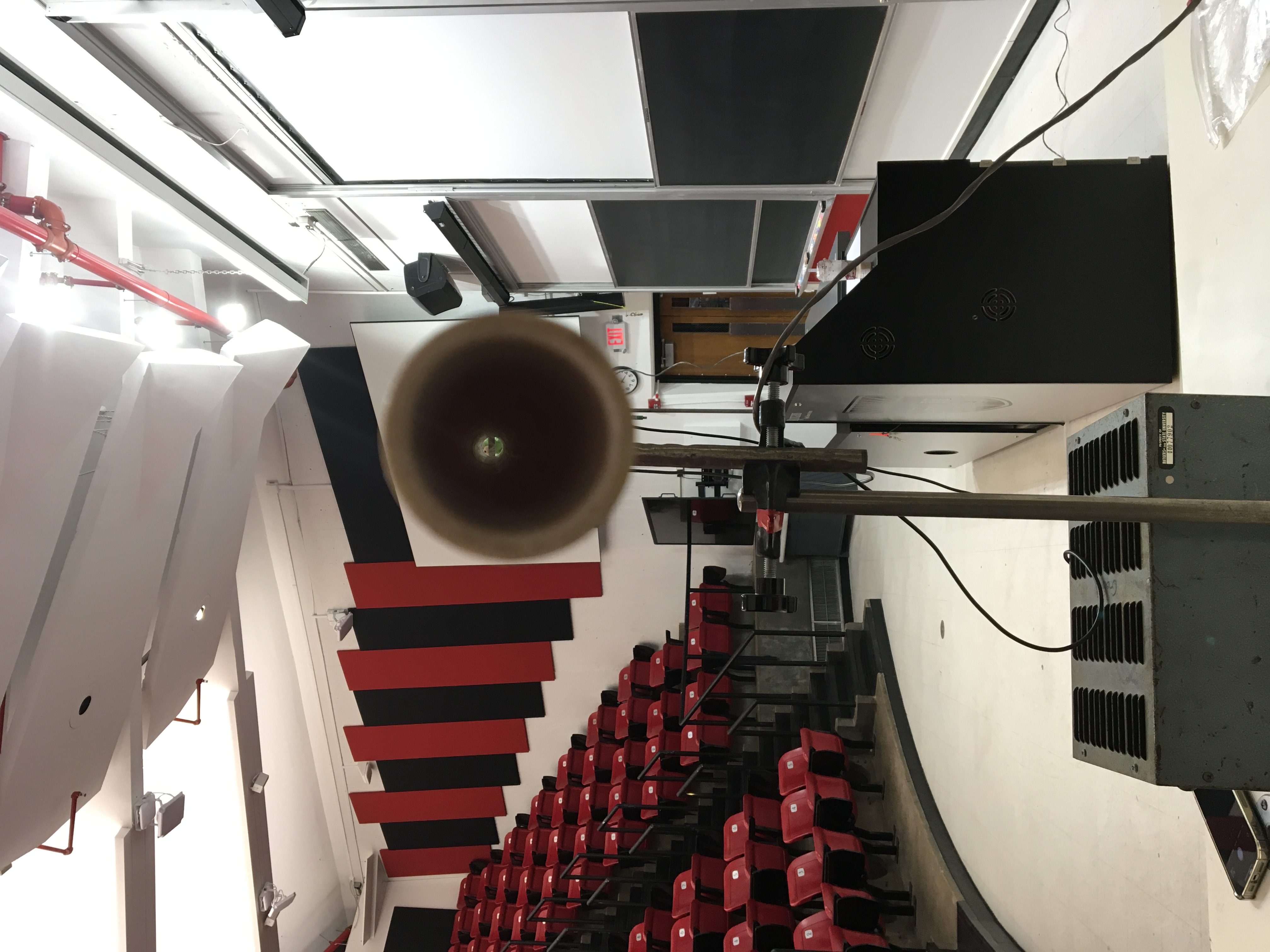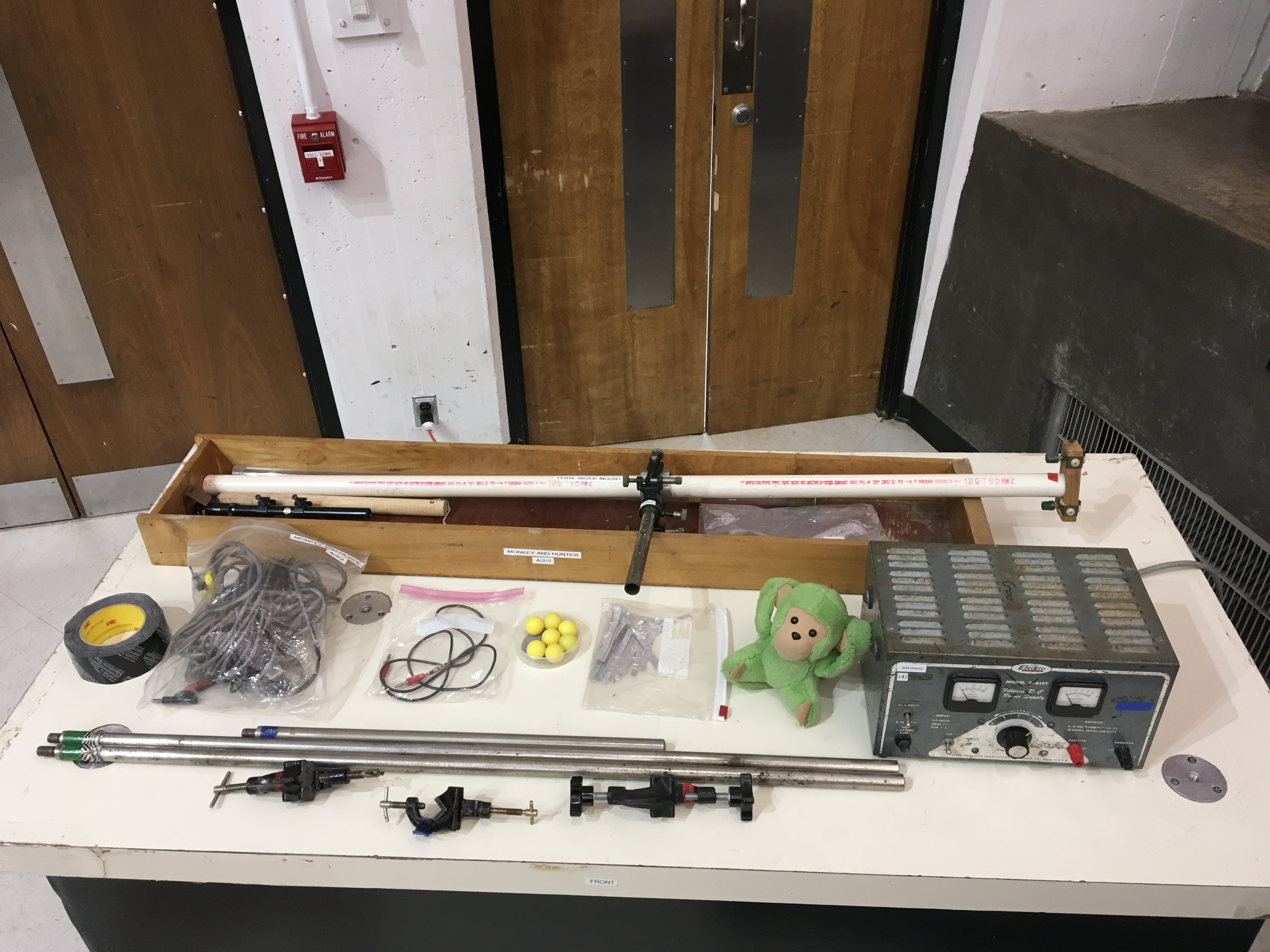 Description: Blow a ball through a tube. Tin foil at muzzle disconnects the circuit which turns off the electromagnetic and drops the monkey. The ball hits the monkey.