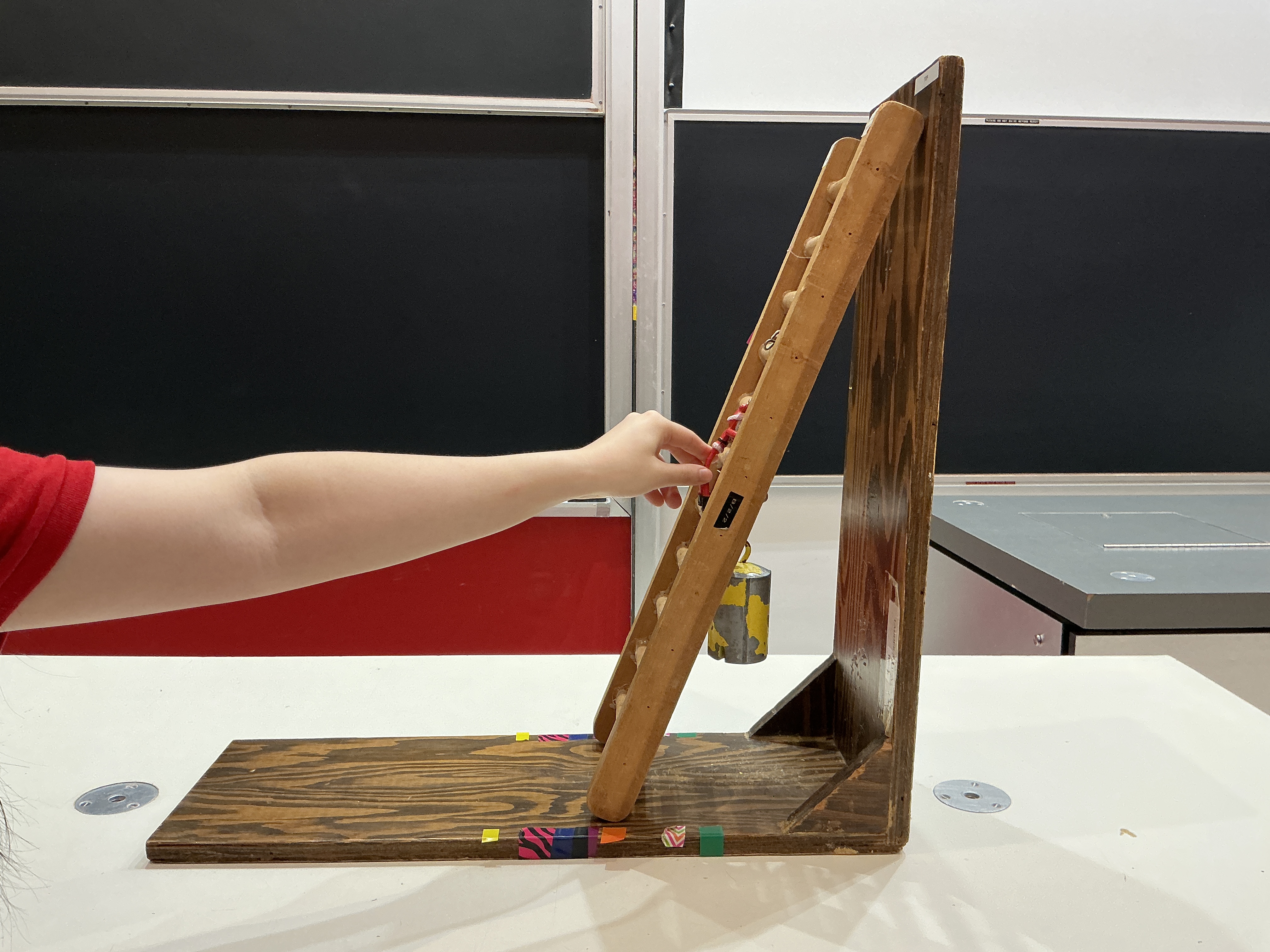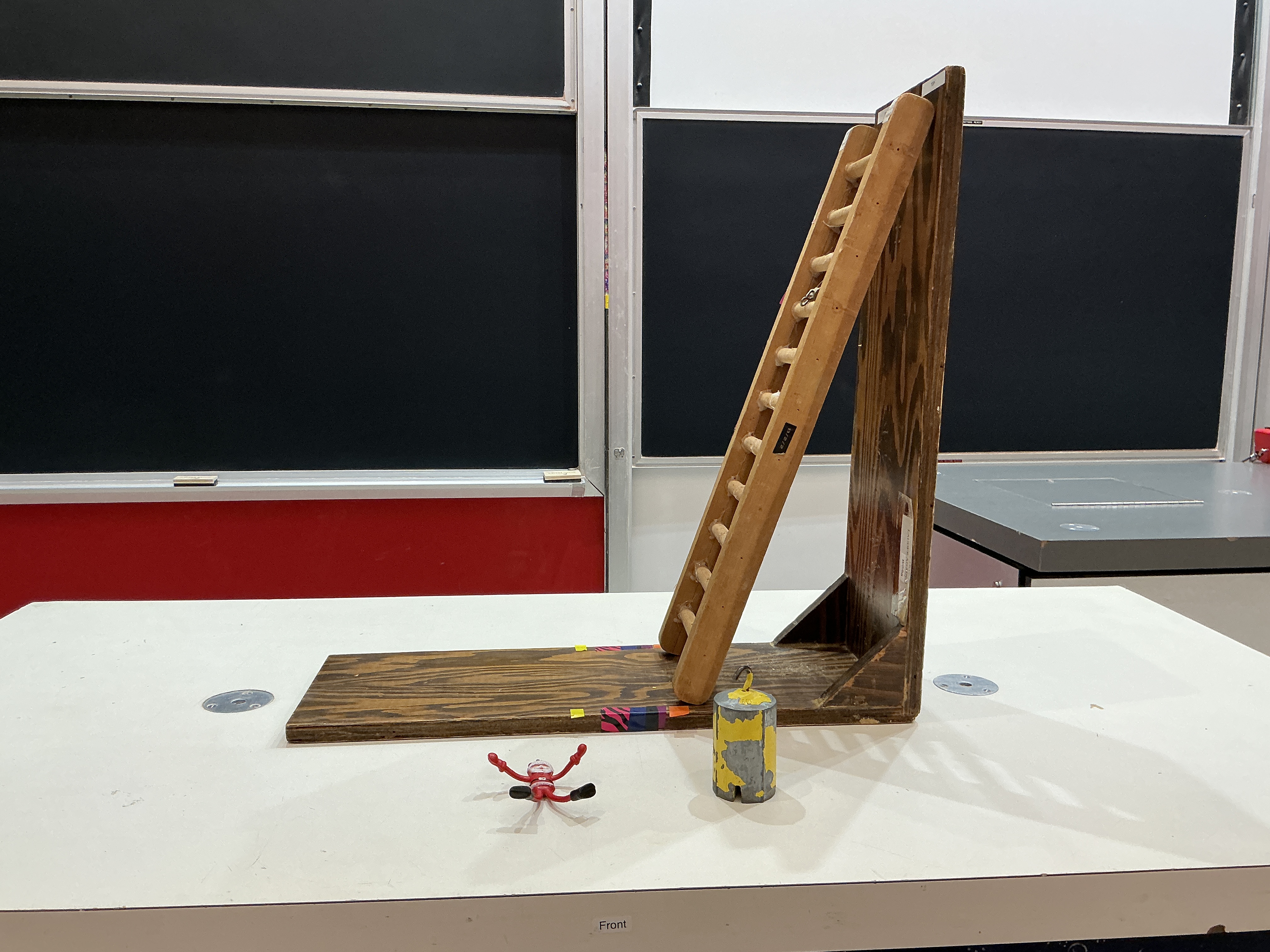 Description: A model ladder is set against a wall and a weight is moved up a ring at a time. Santa figure is used to emphasis where the weight is.