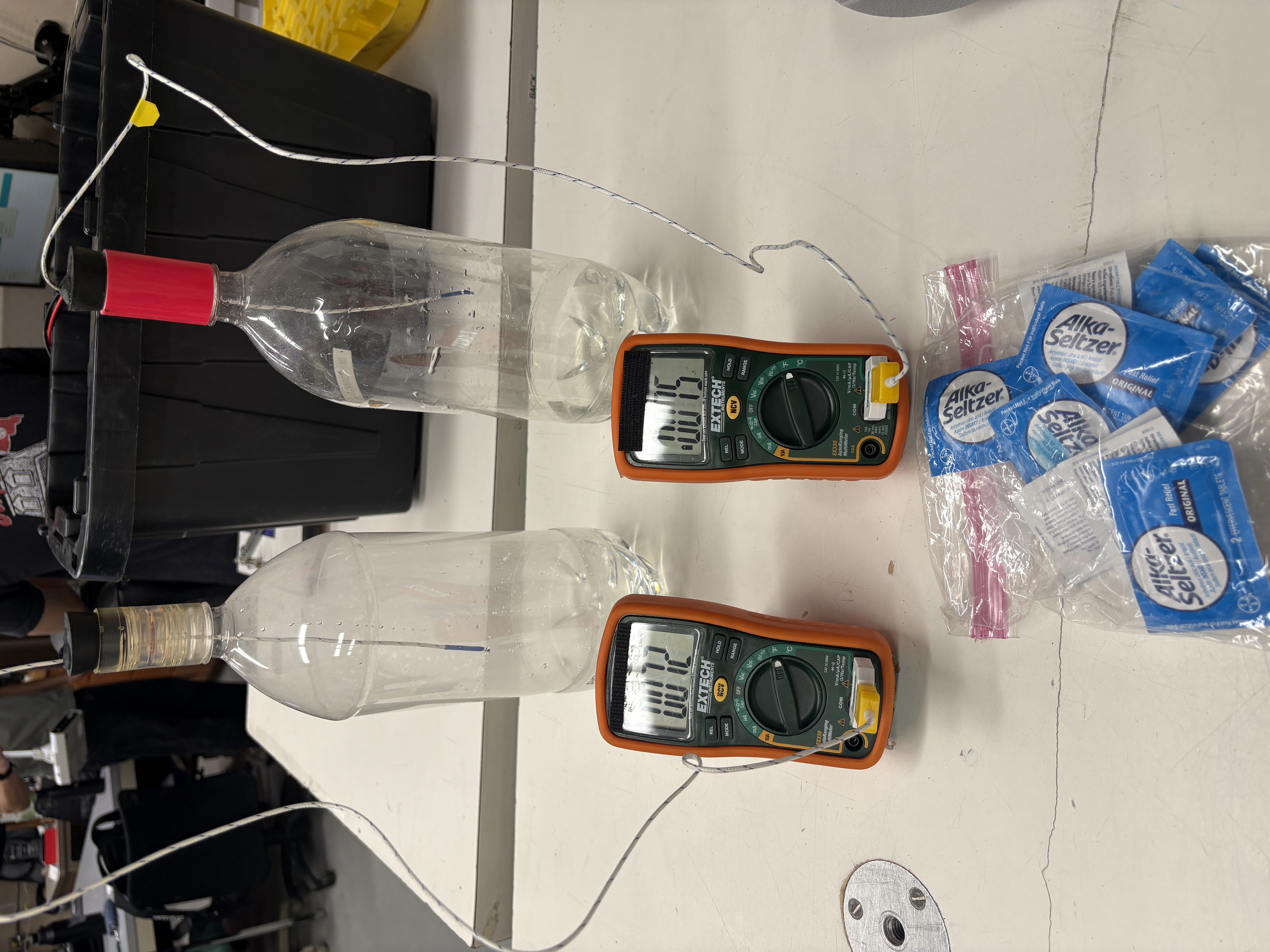 Description: This demonstration compares the temperature of plain water to water reacting with Alka-Seltzer. Both bottles begin at the same temperature, but only the bottle with Alka-Seltzer increases temperature inside the bottle due to the chemical reaction that produces carbon dioxide (CO₂) gas.